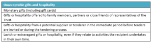 Any Representative of the Trust who is offered any of the unacceptable gifts or hospitality outlined in the section above that are over the £40 value, should politely decline the offer and complete a form for inclusion on the gifts and hospitality register.