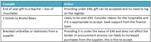Gifts from pupils generally fall under the £40 limit and can be accepted, provided they do not fall into the unacceptable gifts list. A gift from a class not an individual pupil over £40, would be classed as a single gift and will require approval.